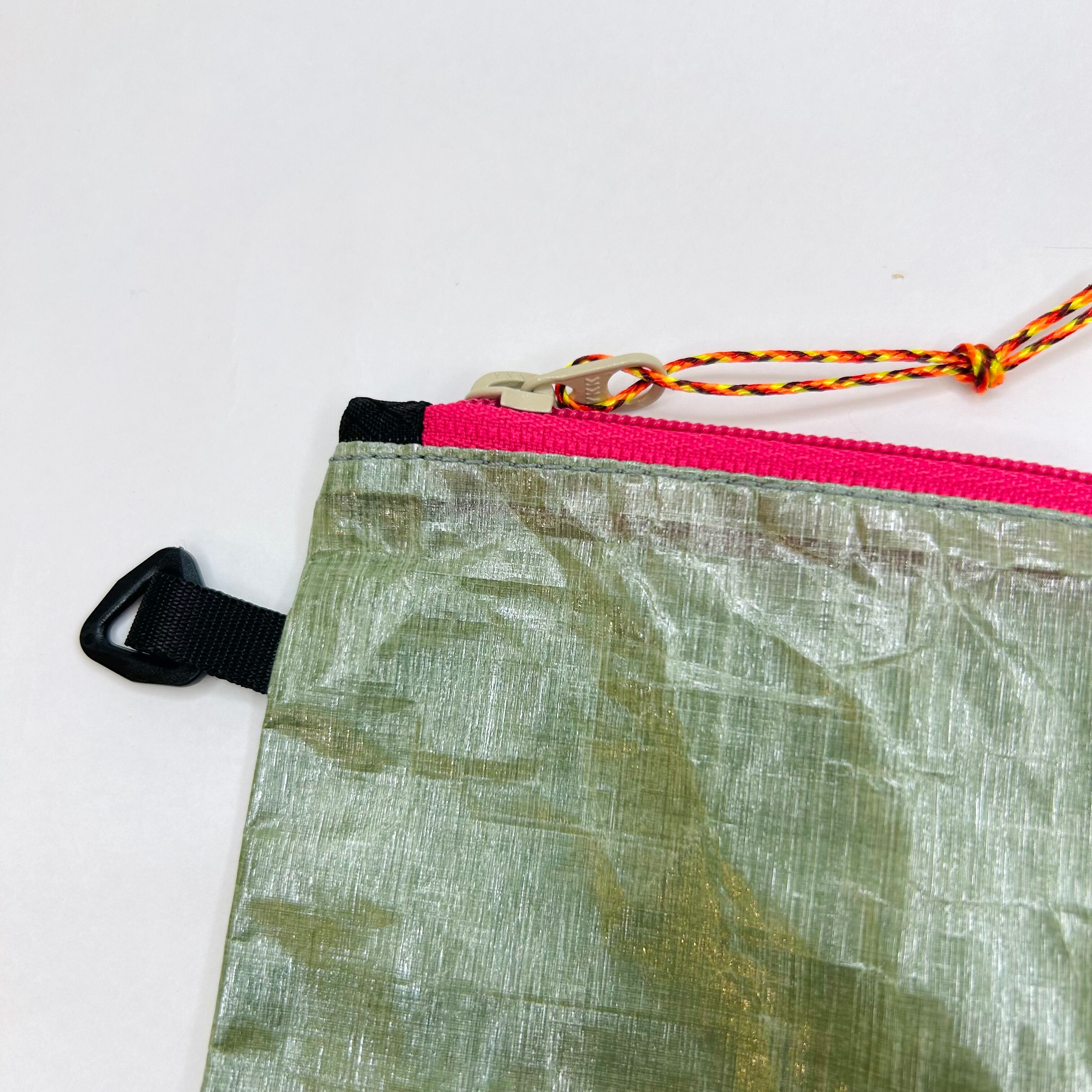 サイドの小さな三角パーツに、必要に応じてカラビナ等を付けて頂くと、ショルダーやサコッシュにさっと引っかけられます。